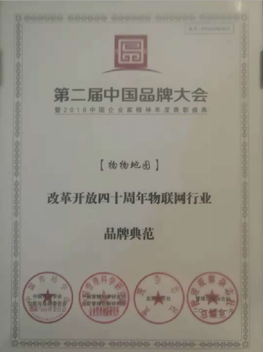 2018中国品牌大会授予物物地图“中国物联网管理创新产业品牌十强”称号;